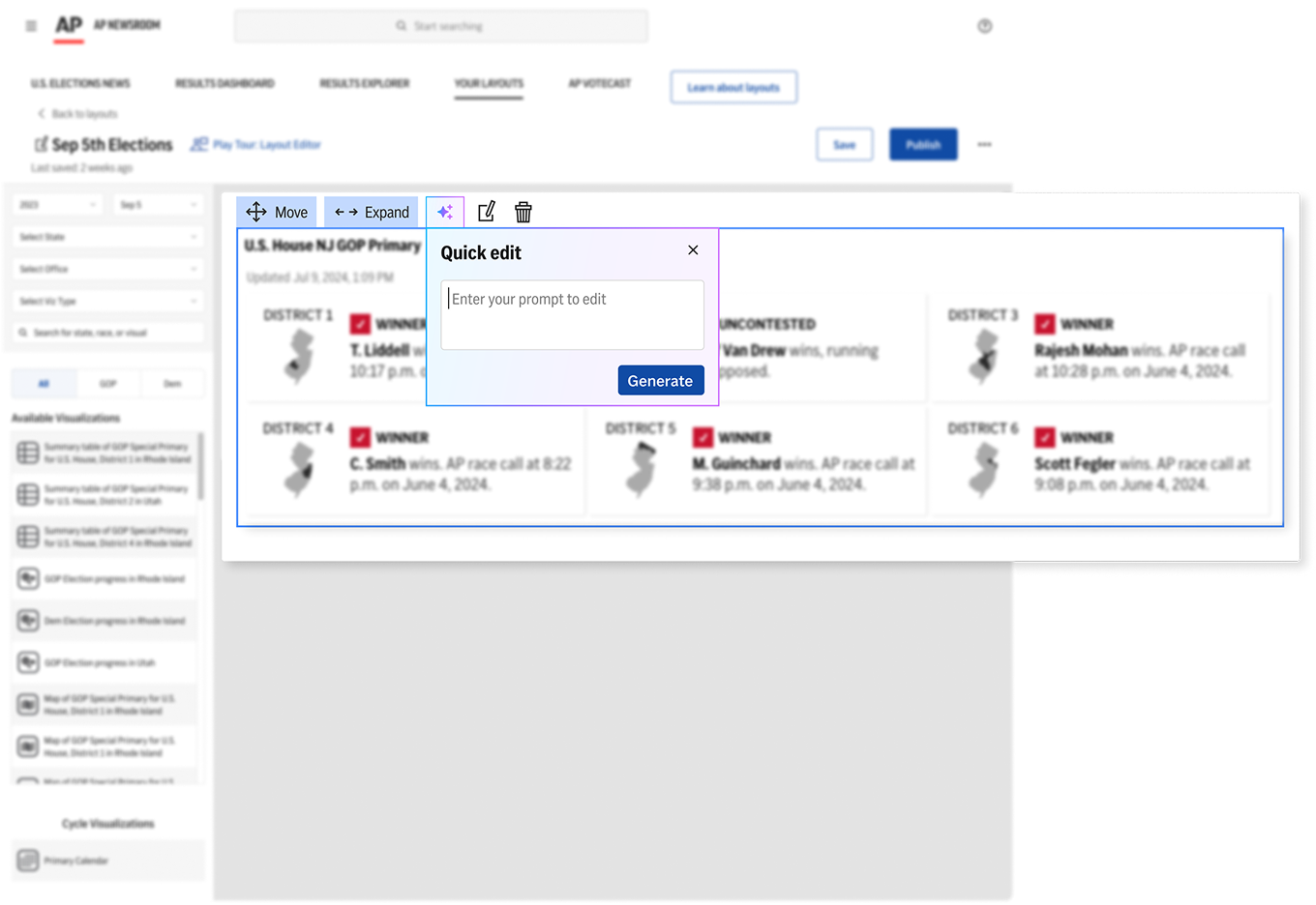 The AP’s reputation relies on factual accuracy, and we couldn't risk introducing AI-generated errors into published election visualizations. This direction would require a more robust editorial review system before it's viable to ship.